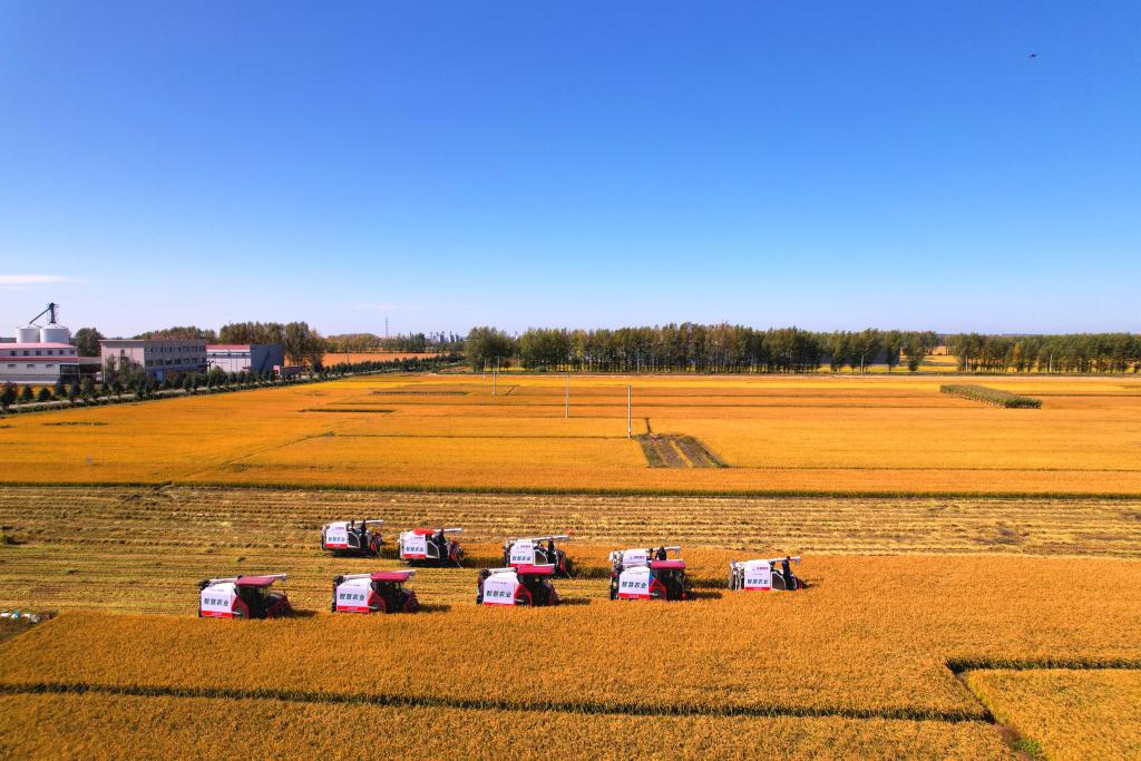 黑龍江省綏化市北林區的水稻科技示范田里正在進(jìn)行收獲作業(yè)。新華社發(fā)(蔣寶棟攝)