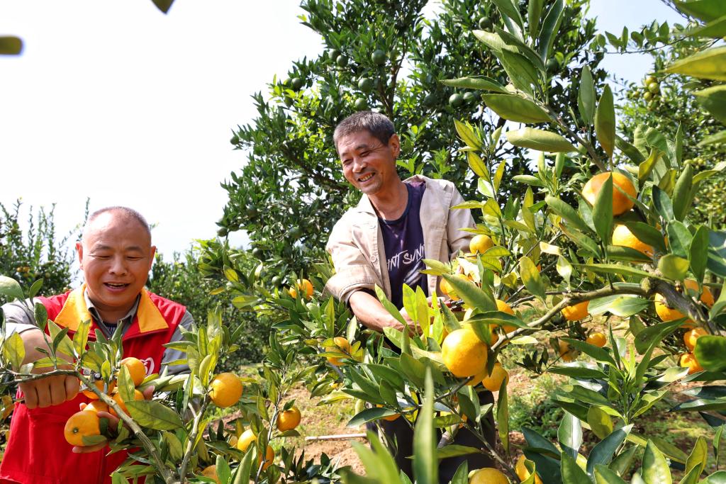 10月14日,宋家梁子片區村民張澤月在徐英家幫忙采摘柑橘。(楊志英 攝)