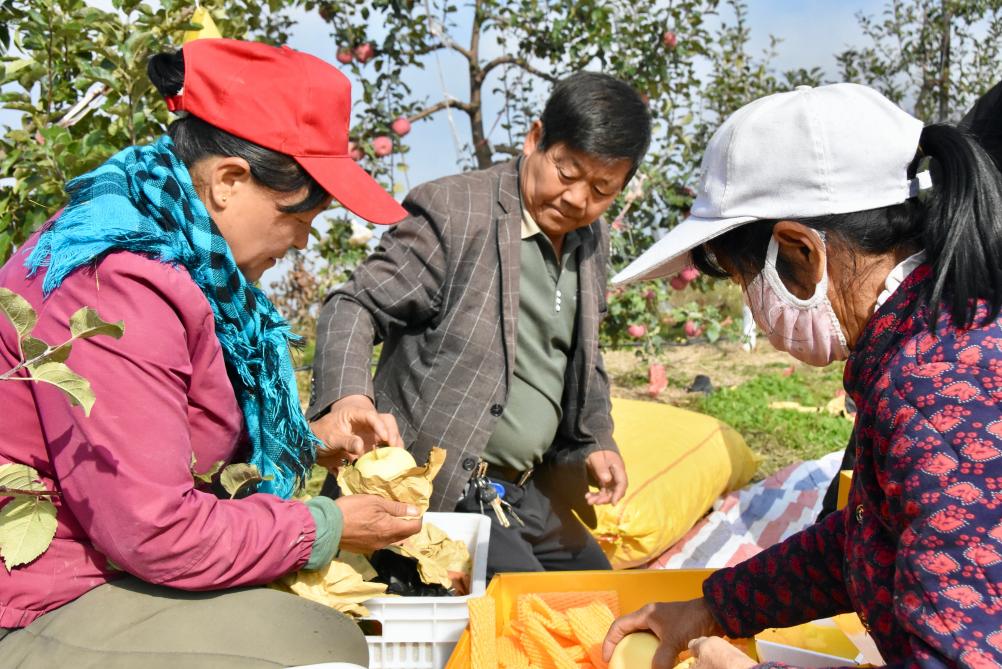李志斌(中)和村民一起給蘋(píng)果裝箱。 新華社記者 鄭昕 攝