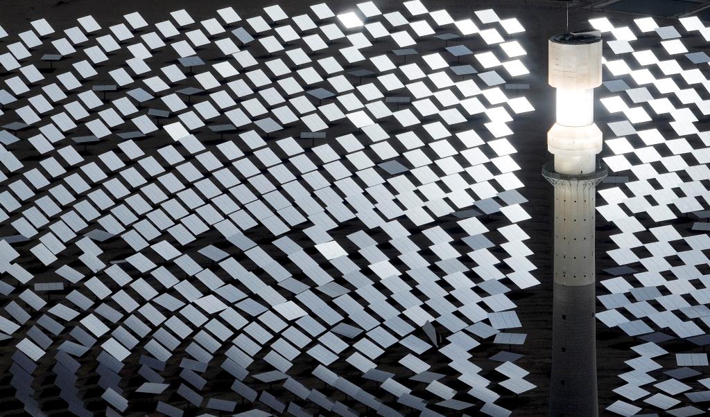蔚藍色的光伏板在陽(yáng)光照射下熠熠生輝,光能便轉化成源源不斷的電能;風(fēng)力發(fā)電機的葉片迎風(fēng)飛轉,風(fēng)被“捕捉”進(jìn)一條條輸電線(xiàn);百米高的吸熱塔和“鏡子海洋”組成熔鹽塔式光熱電站,科技感與綠色減碳有機結合……