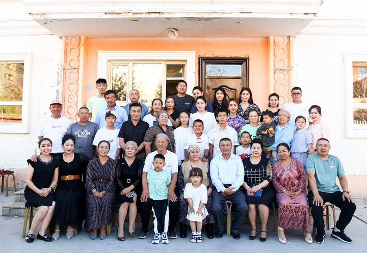 在位于新疆青河縣的家中,阿尼帕(前排右五)和家人一起拍攝全家福(2022年7月10日攝)。組圖均由新華每日電訊記者 王菲 攝