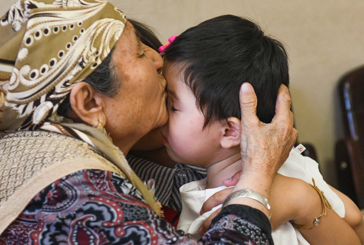 在位于新疆青河縣的家中,阿尼帕在親吻家人(2022年7月10日攝)。