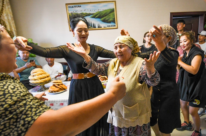在位于新疆青河縣的家中,阿尼帕(中)和家人在歡度古爾邦節時(shí)跳舞(2022年7月10日攝)。