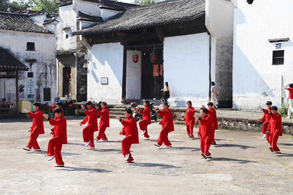 圖為中老年人在諸葛村鐘池池畔打太極拳。新華社記者張曉潔 攝