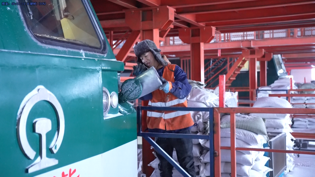 每逢降雪天氣,每臺機車(chē)在啟動(dòng)和停車(chē)時(shí)都要撒上機砂。為了保障機車(chē)運行,苗壯和班組的其他成員隨時(shí)都要到倉庫將防滑砂運到機車(chē)整備棚。