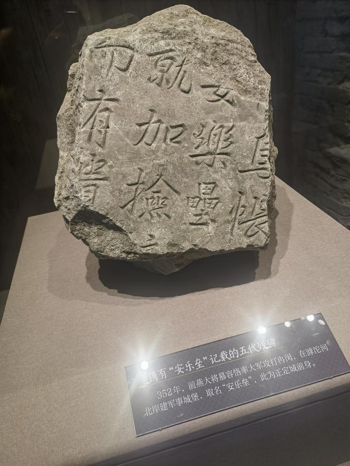 351年,前燕大將慕容恪在正定一帶筑安樂(lè )壘,一般認為安樂(lè )壘即今正定城前身。正定博物館里有安樂(lè )壘大門(mén)模型,門(mén)額大字取自石碑殘塊,那塊原件在模型旁邊展出。