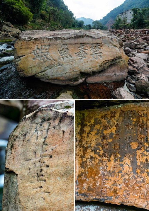 初冬時(shí)節的赤水支流桂花河水流平緩,順著(zhù)水稻田坎下到岸邊,一塊鐫刻著(zhù)“禁毒魚(yú)蝦”四個(gè)正楷大字的巨石立于河畔,左上角款識題作“府正堂示”?!罢谩?,是清代主官的代稱(chēng)。這樣的碑刻在黃荊鎮還有兩處?!把睾佣爵~(yú)大傷生命,水流下游人飲亦病?!睒闼氐奈淖值莱隽它S荊老林先民們的“環(huán)保意識”。