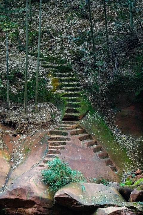 碑刻下游,依山開(kāi)鑿的茶鹽古道仍清晰可辨,紅砂巖上覆滿(mǎn)青苔,馬鈴聲聲猶在耳畔。