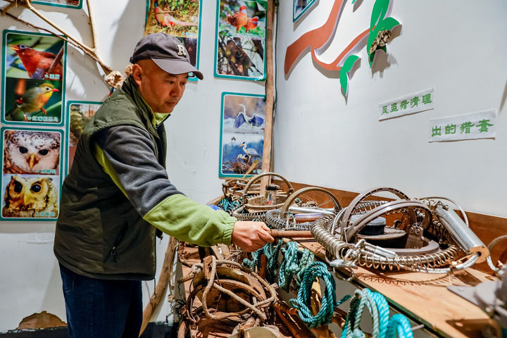 自然保護中心展示反盜獵清理出的獵套(11月11日攝)。新華每日電訊記者 沈伯韓 攝