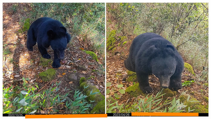 左圖:這是古藺縣赤水源黃荊老林自然保護中心布設在黃荊老林中的紅外相機拍攝的亞洲黑熊(2022年10月25日攝)右圖:這是在黃荊老林拍攝的亞洲黑熊(4月26日攝)。顏宇供圖