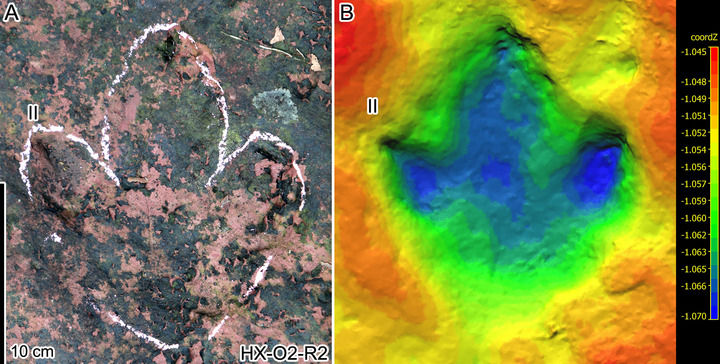 這是在古藺縣黃荊鎮漢溪村石鳳窩拍攝的獸腳類(lèi)恐龍足跡和研究影像(2014年7月10日攝)。徐挺供圖