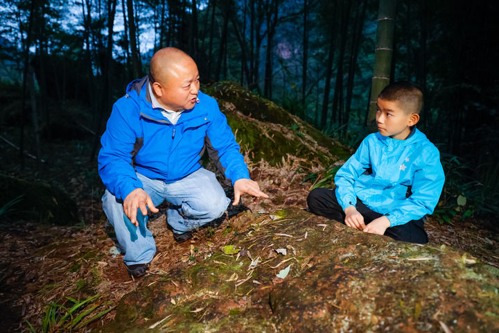 古藺縣文史愛(ài)好者徐挺總愛(ài)帶著(zhù)兒子來(lái)這片森林里探險“尋寶”,他也熱心于向人們展示和講解那些腳印。