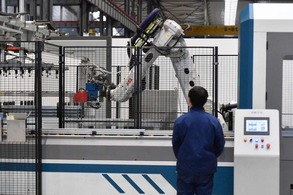工人在位于杭州市臨平區的西奧電梯數字工廠(chǎng)內的自動(dòng)化智能生產(chǎn)線(xiàn)工作(2021年12月17日攝)。新華社記者 黃宗治 攝