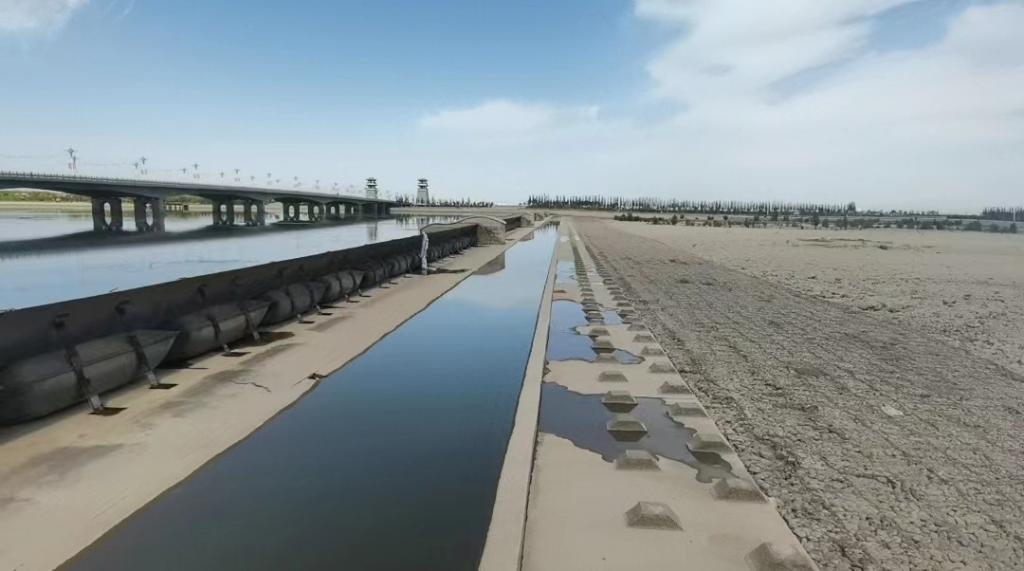 2023年8月24日,督察組前期暗查看到甘州區黑河新城大橋下游建設的橡膠壩在蓄水。(中央第四生態(tài)環(huán)境保護督察組供圖)