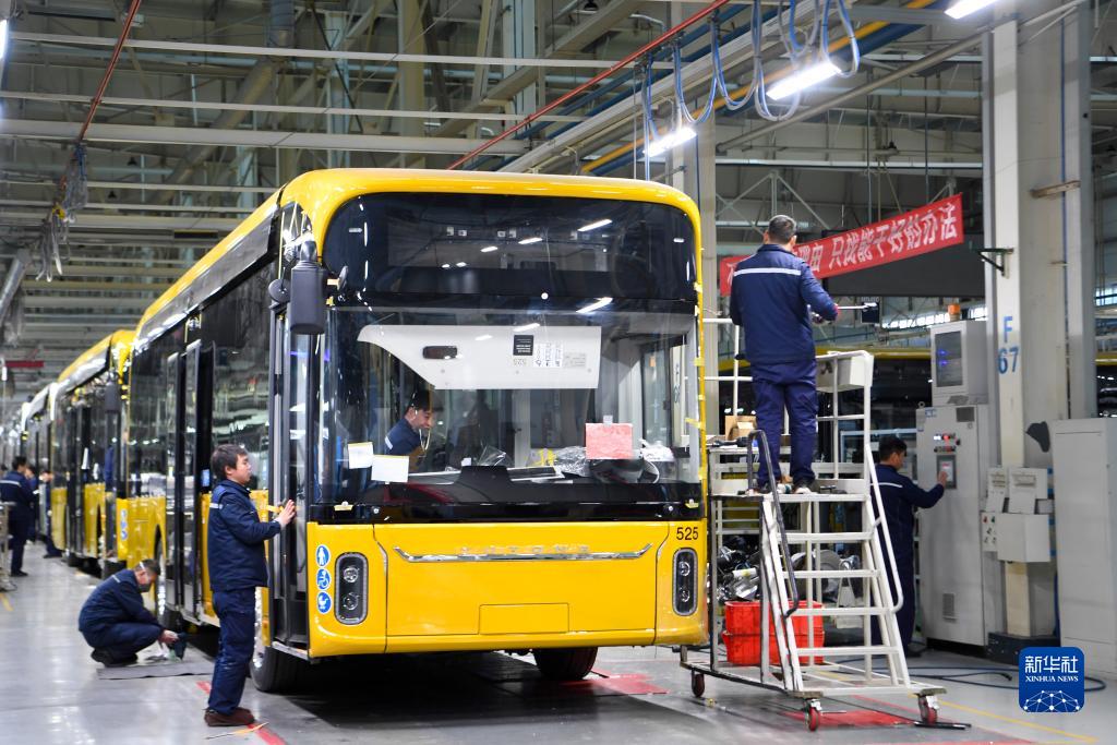 2023年11月30日,工作人員在宇通新能源廠(chǎng)區高端及海外承裝車(chē)間作業(yè)。新華社記者 郝源 攝