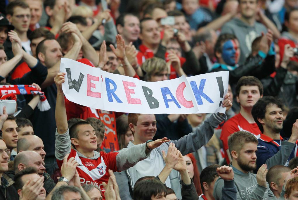 2012年5月20日,在溫布利球場(chǎng)舉行的2011-2012賽季英格蘭足球全國聯(lián)賽附加賽決賽的比賽中,約克城隊2:1力克盧頓城隊,奪得冠軍。圖為約克城隊球迷慶祝勝利。新華社發(fā)