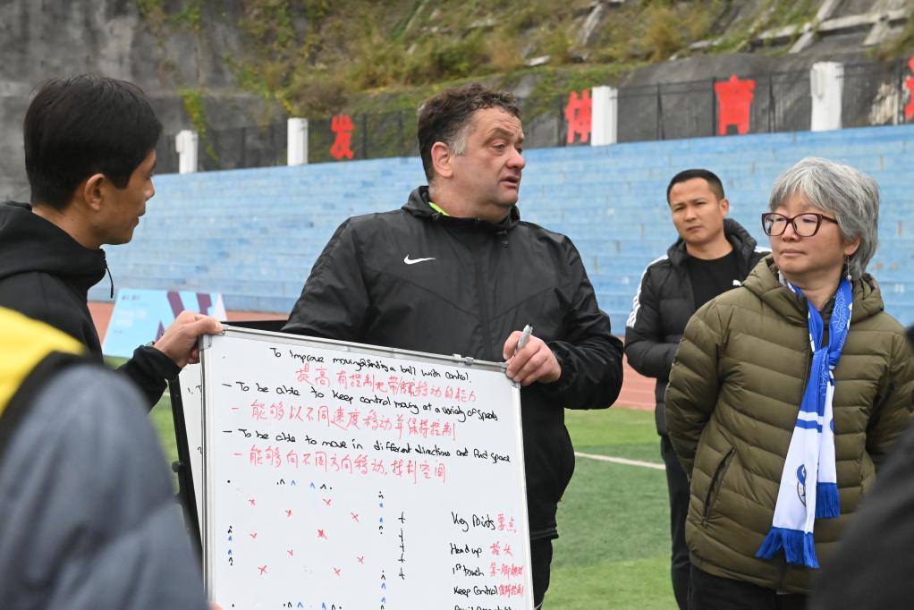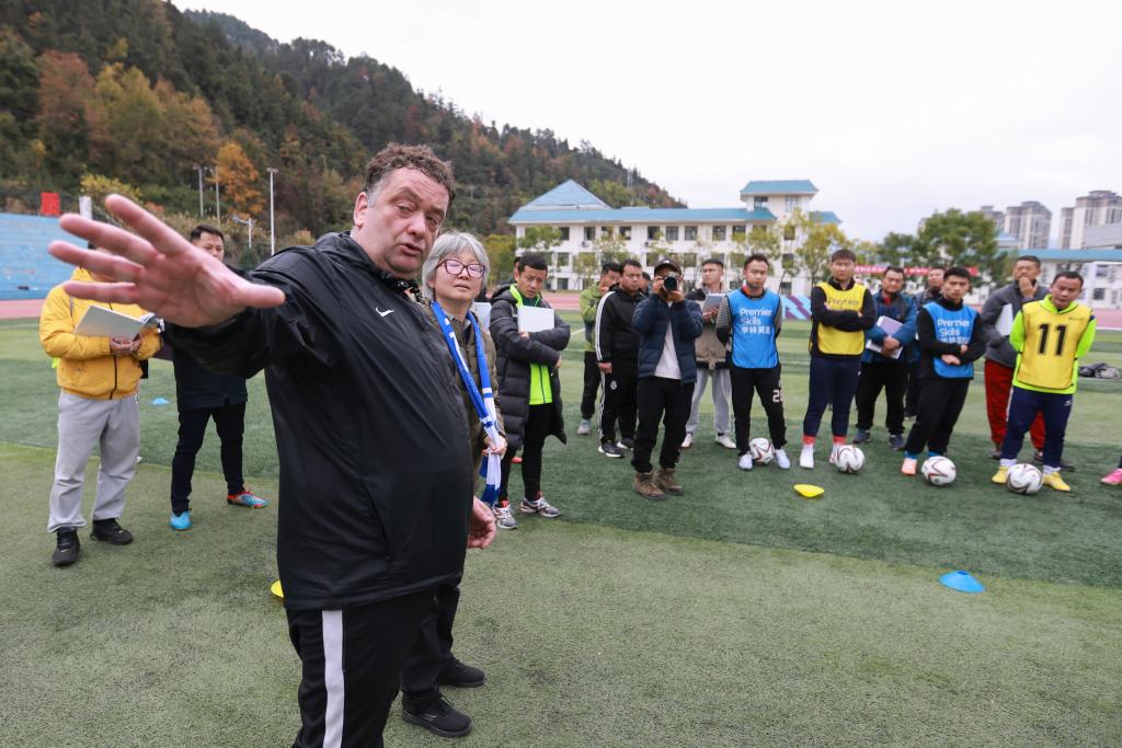 12月12日,利特(前)為參加“學(xué)轉英超”基層足球教練培訓項目的學(xué)員授課