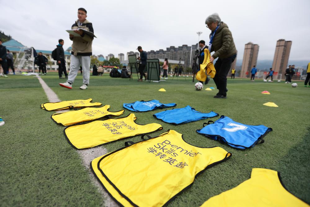 12月12日,“學(xué)轉英超”基層足球教練培訓項目工作人員整理訓練背心