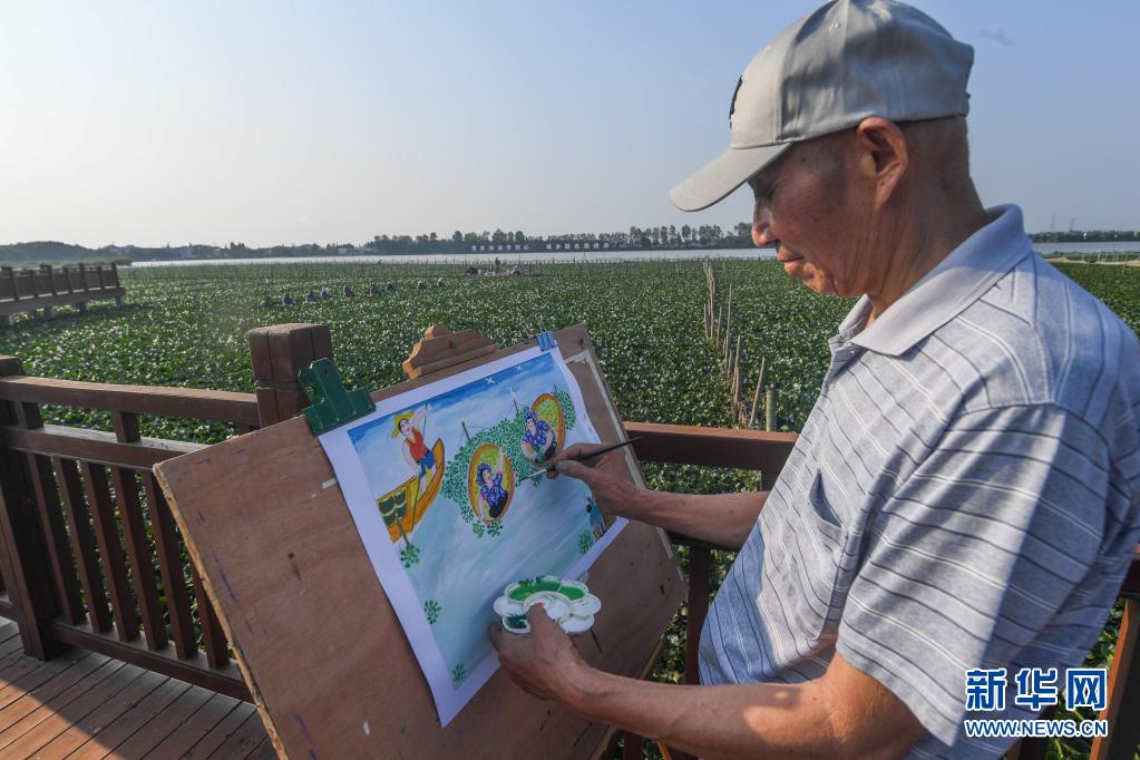 8月19日,在浙江省嘉興市秀洲區油車(chē)港鎮西千畝蕩,一名農民畫(huà)愛(ài)好者在創(chuàng )作采菱主題作品。