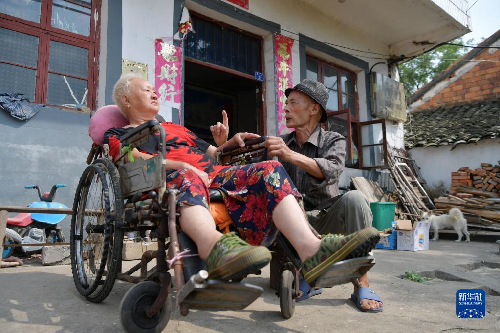 在江西省南昌縣三江鎮徐羅村,羅安民陪著(zhù)老伴在院子里聊天(9月5日攝)。雖然老伴因為患病不能說(shuō)話(huà),但她能聽(tīng)懂羅安民的每一句話(huà)。