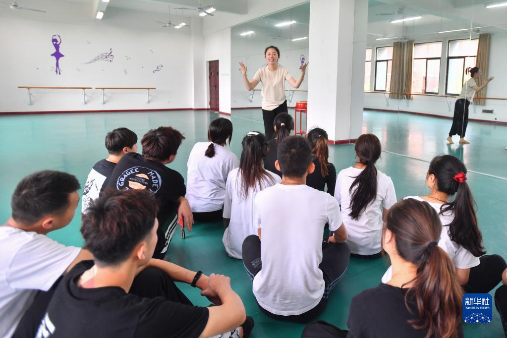 在長(cháng)沙職業(yè)技術(shù)學(xué)院特殊教育學(xué)院的舞蹈房里,鄧蕓虹用手語(yǔ)為學(xué)生講解舞蹈內容(9月7日攝)。