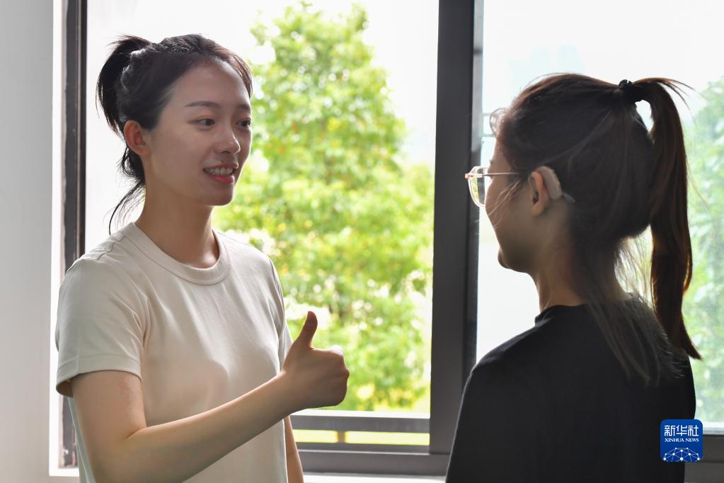 在長(cháng)沙職業(yè)技術(shù)學(xué)院特殊教育學(xué)院的舞蹈房里,鄧蕓虹(左)用手語(yǔ)鼓勵學(xué)生(9月7日攝)。