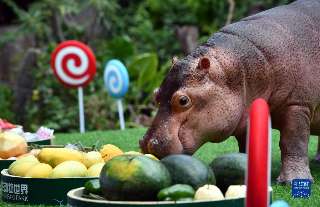 9月9日,廣州長(cháng)隆野生動(dòng)物世界的河馬菲菲在自己的兩歲生日會(huì )上享受美食。