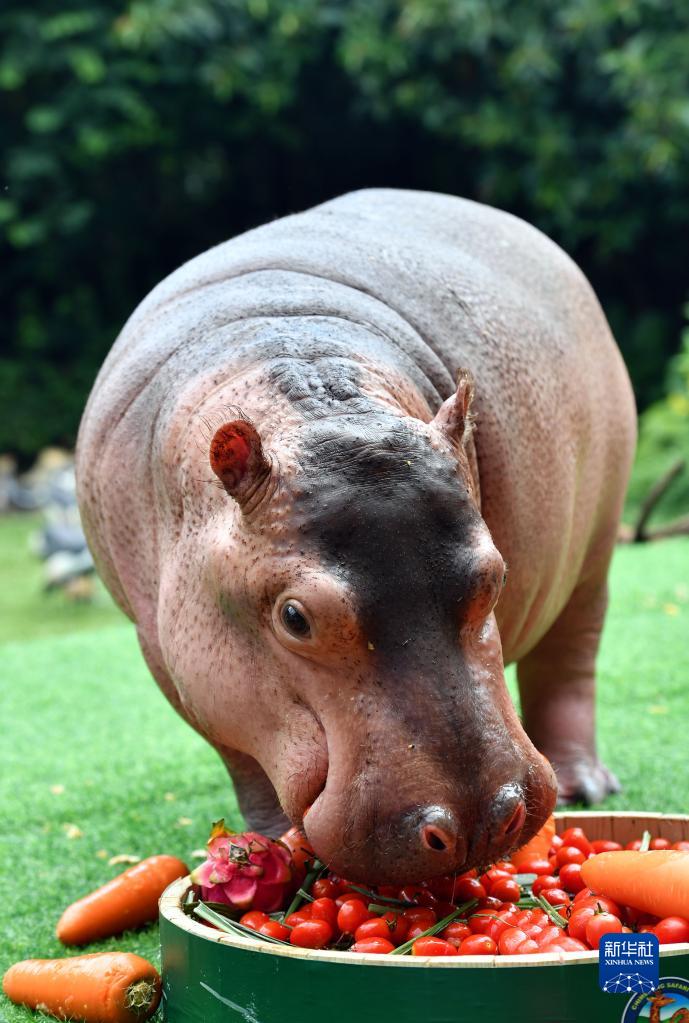 9月9日,廣州長(cháng)隆野生動(dòng)物世界的河馬菲菲在自己的兩歲生日會(huì )上享受美食。