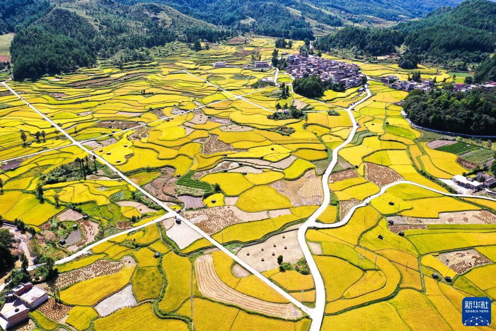 連日來(lái),貴州省黔南布依族苗族自治州龍里縣灣灘河鎮天氣晴好。水稻成熟,田野鍍金,農民搶收稻谷,一片豐收景象。