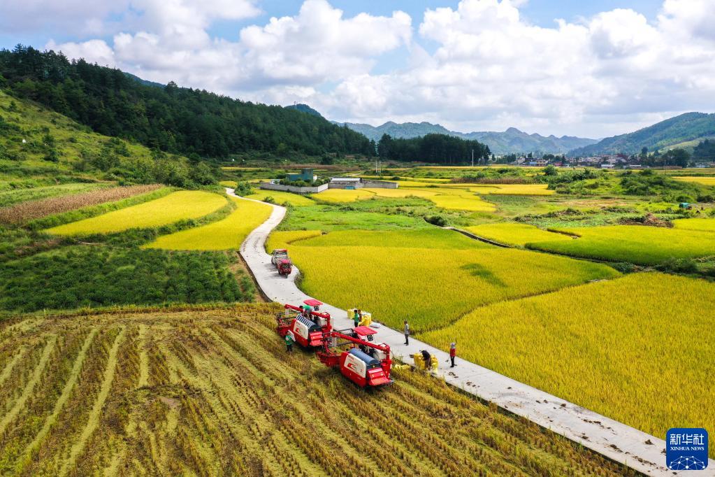 連日來(lái),貴州省黔南布依族苗族自治州龍里縣灣灘河鎮天氣晴好。水稻成熟,田野鍍金,農民搶收稻谷,一片豐收景象。
