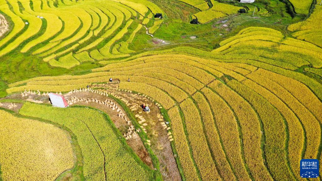 連日來(lái),貴州省黔南布依族苗族自治州龍里縣灣灘河鎮天氣晴好。水稻成熟,田野鍍金,農民搶收稻谷,一片豐收景象。