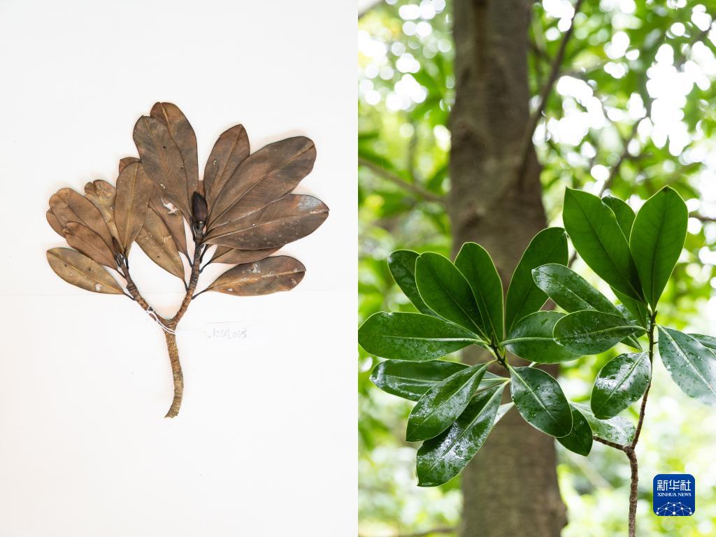 這是10月10日在昆明植物園拍攝的華蓋木。這張拼版照片分別為科研人員野外采集的標本(左)和在植物園遷地保護后存活下來(lái)的同種植物。