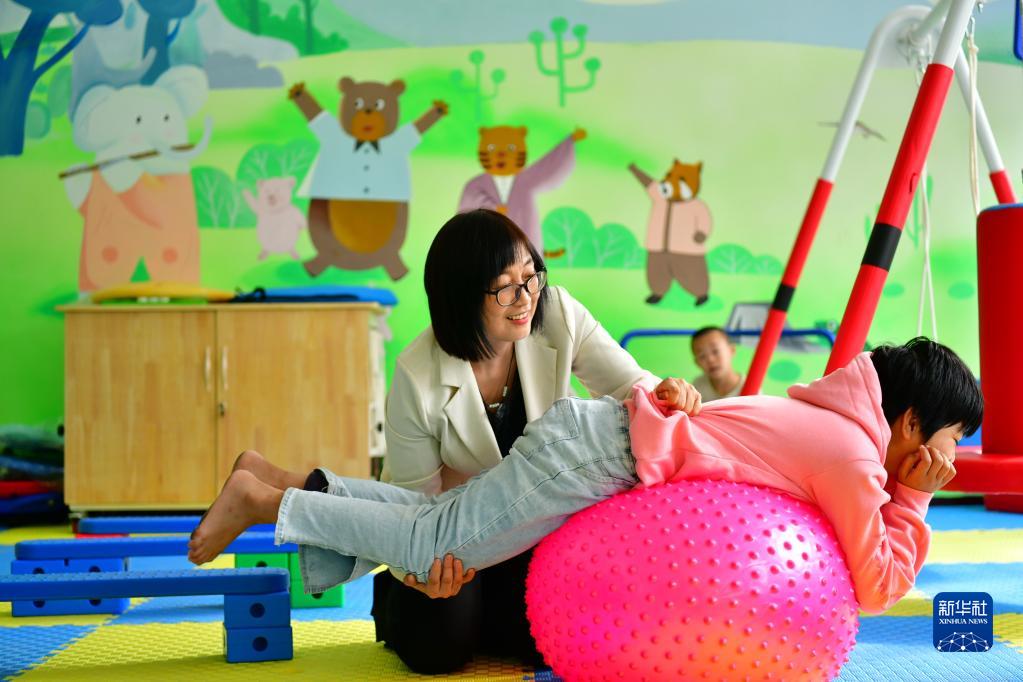 10月13日,張余敏(左)在海興縣特教學(xué)校內帶領(lǐng)一名學(xué)生進(jìn)行感統訓練。