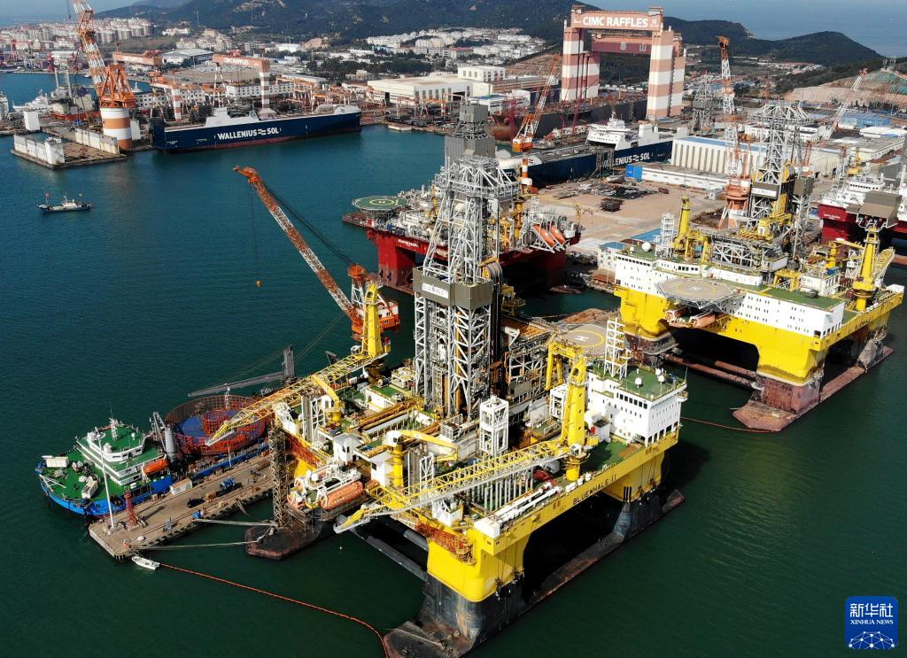 “藍鯨1號”(前右)及姊妹平臺“藍鯨2號”(前左)正在其生產(chǎn)基地中集來(lái)福士海洋工程有限公司煙臺基地進(jìn)行維護和保養(10月18日攝,無(wú)人機照片)。