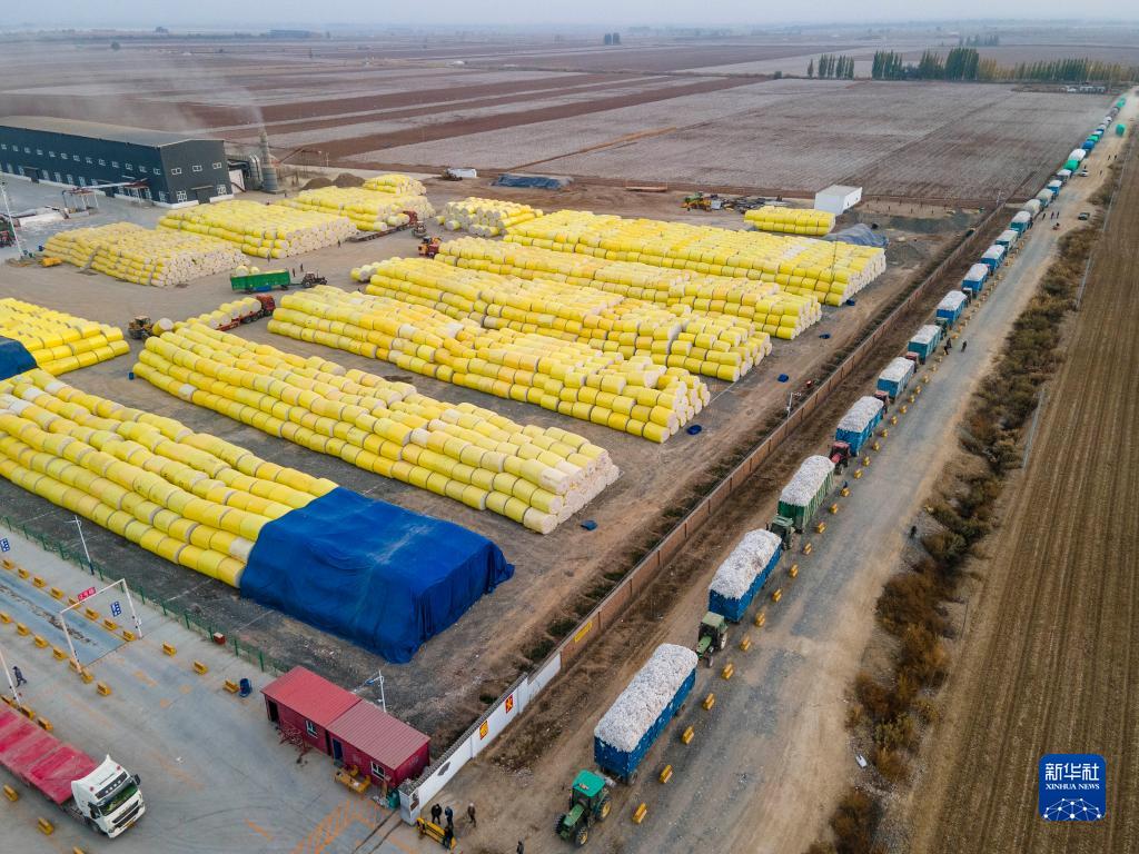 新疆沙灣市的棉農在一家棉花收購廠(chǎng)外排隊等候銷(xiāo)售(10月20日攝,無(wú)人機照片)。
