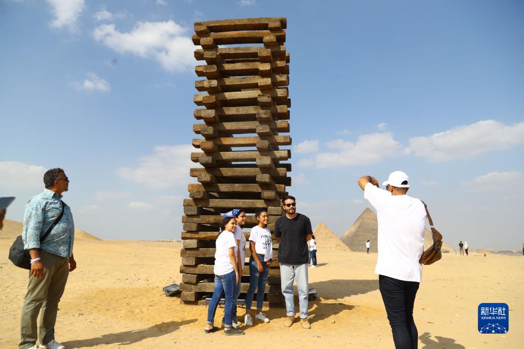 10月21日,在埃及吉薩金字塔景區舉辦的藝術(shù)展上,游客在一件藝術(shù)作品前留影。