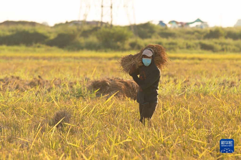 10月25日,農民在老撾萬(wàn)象城邊的田地里收割稻谷。