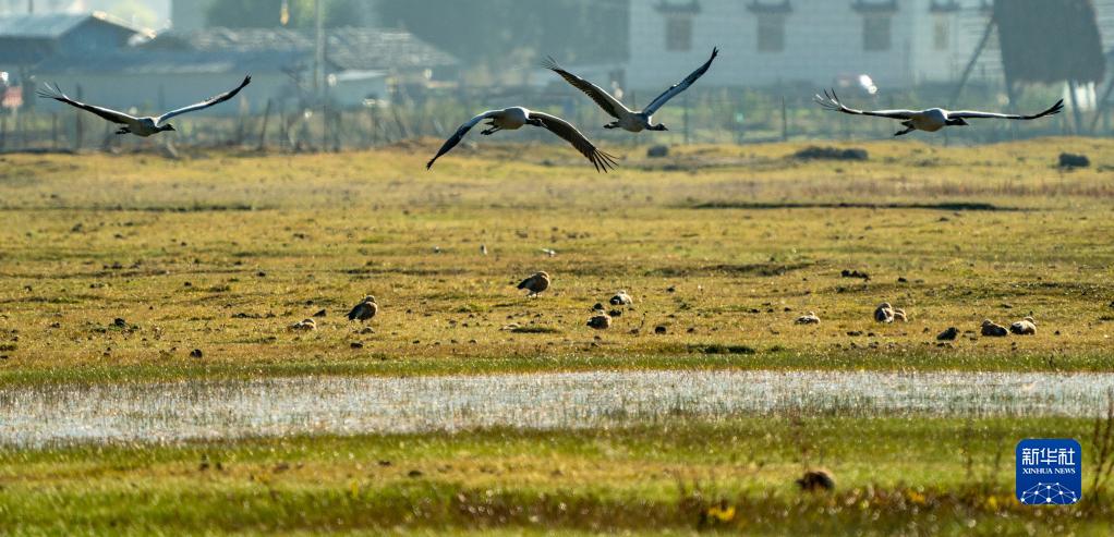 入秋以來(lái),云南省迪慶藏族自治州香格里拉市納帕海國際重要濕地迎來(lái)越冬黑頸鶴。首批黑頸鶴抵達以來(lái),已監測到200余只。