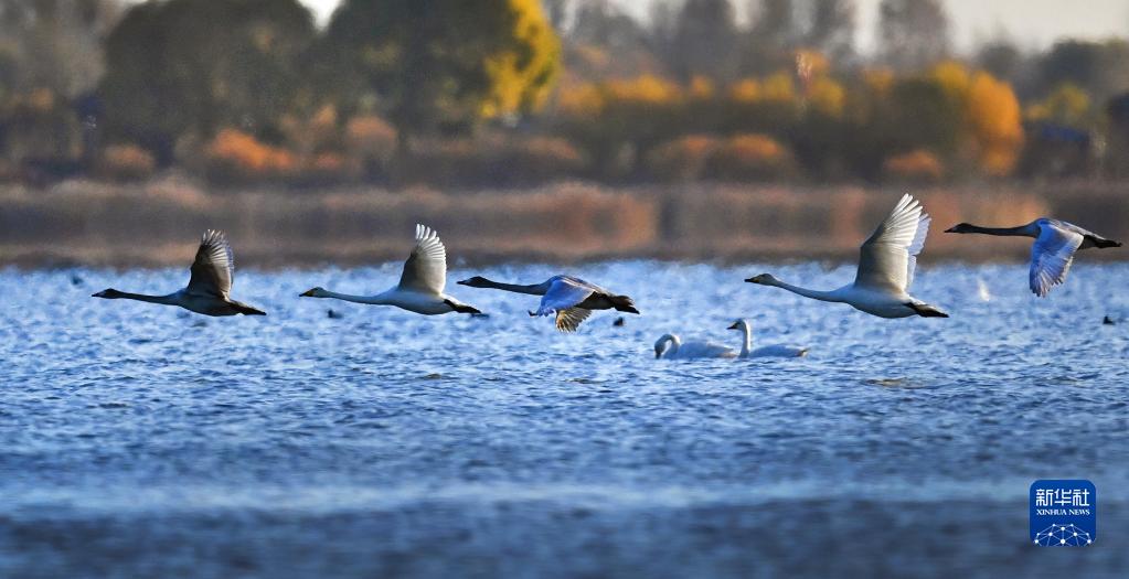 10月31日,白天鵝在河口水庫濕地飛翔。