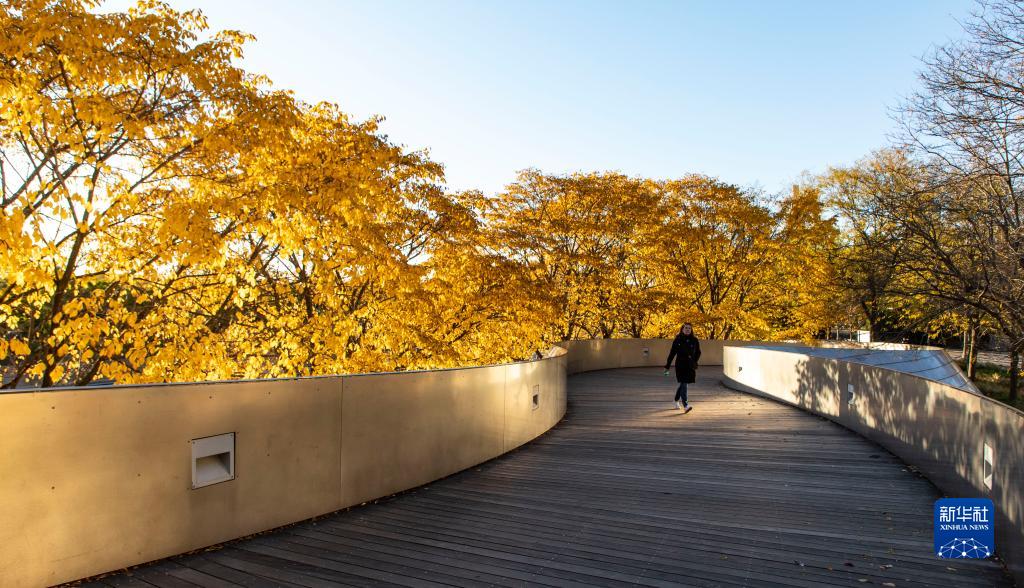11月2日,在美國芝加哥千禧公園,一名行人走在秋色中。
