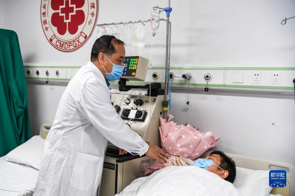 在廣西醫科大學(xué)第一附屬醫院,造血干細胞捐獻者李醫生的同事(左)來(lái)探望他(2021年11月攝)。