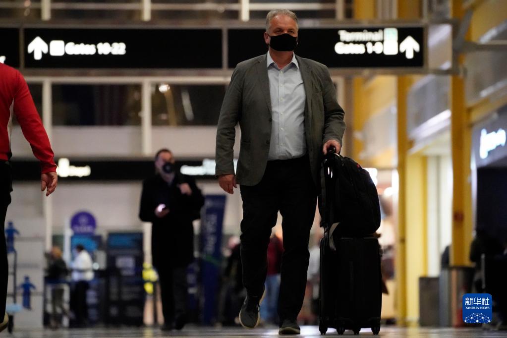 11月8日,在美國弗吉尼亞州阿靈頓的里根國家機場(chǎng),旅客戴著(zhù)口罩走在航站樓里。