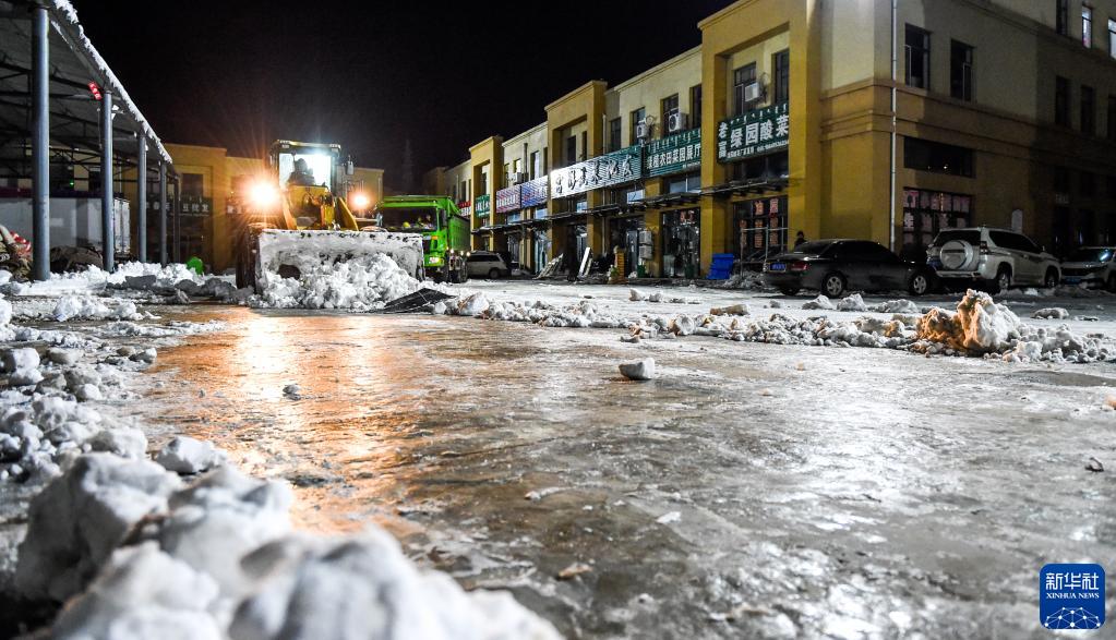 11月11日晚,在通遼市運達綠色農副產(chǎn)品批發(fā)市場(chǎng),作業(yè)車(chē)輛連夜清理積雪。