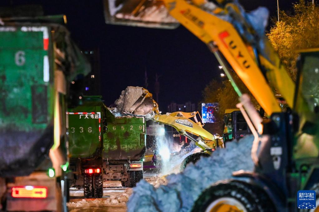 11月11日晚,在通遼市城區,作業(yè)車(chē)輛連夜清理積雪。