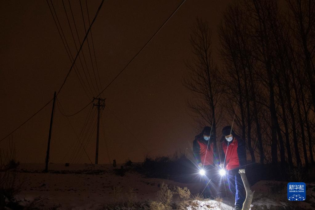 11月21日晚,國網(wǎng)雞西供電公司的工人在雪中巡查線(xiàn)路。
