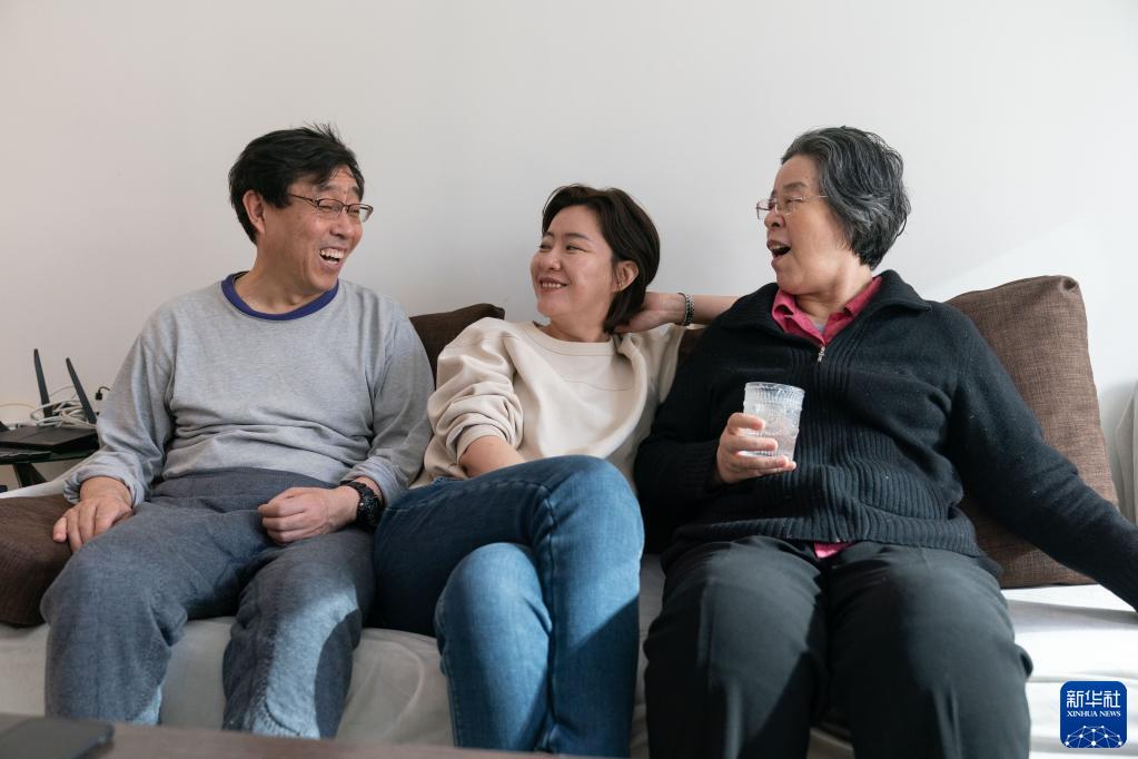 11月24日,剛剛出院的沈建群(右)和老伴兒吳友文(左)、女兒吳姝在北京的住所內聊天。