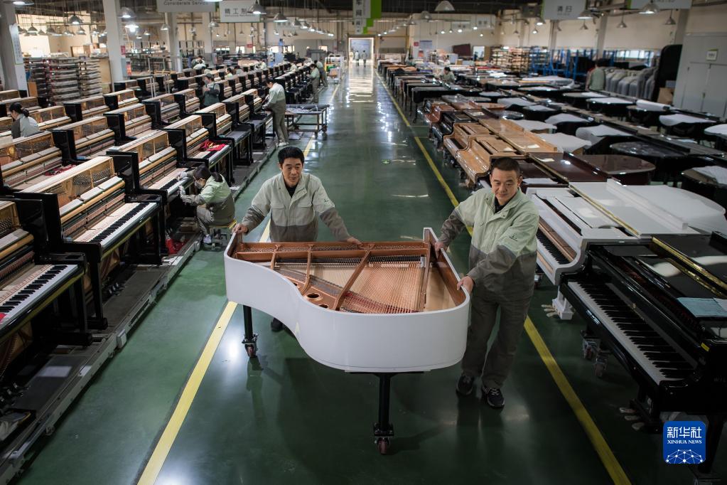 11月23日,工人在柏斯音樂(lè )集團宜昌鋼琴生產(chǎn)基地搬運鋼琴。