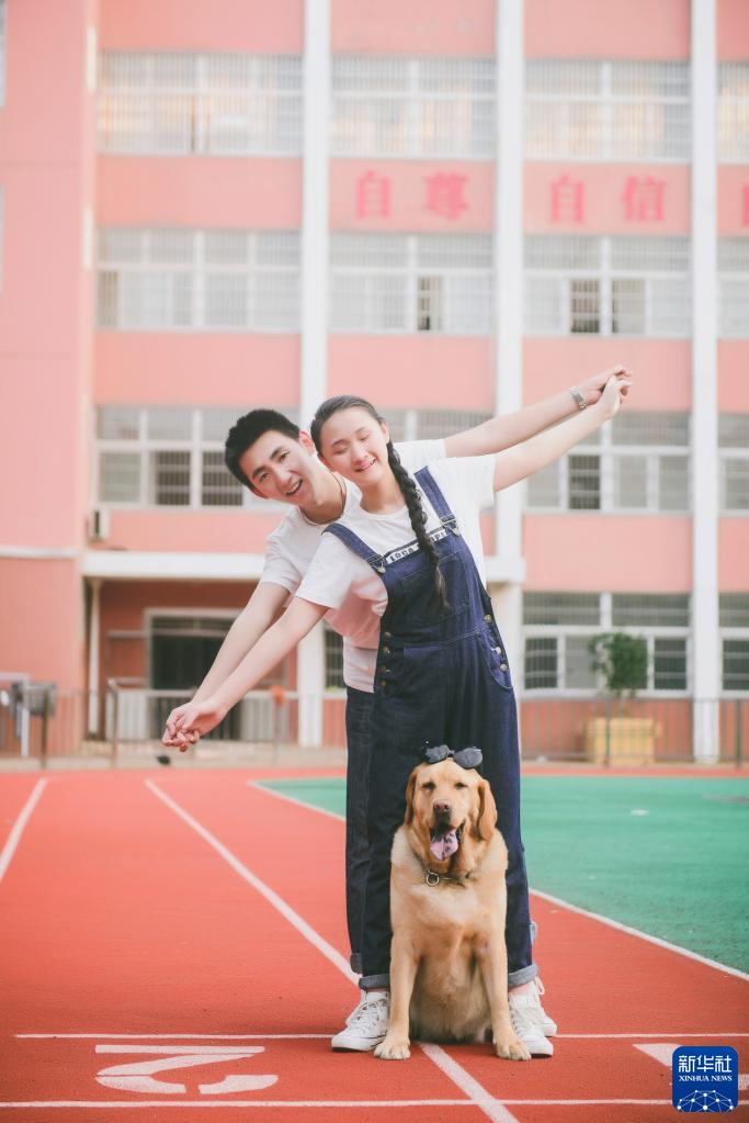 唐聞澤、張晨和領(lǐng)養的導盲犬在安慶市特殊教育學(xué)校內合影(2016年6月4日攝,受訪(fǎng)者提供)。