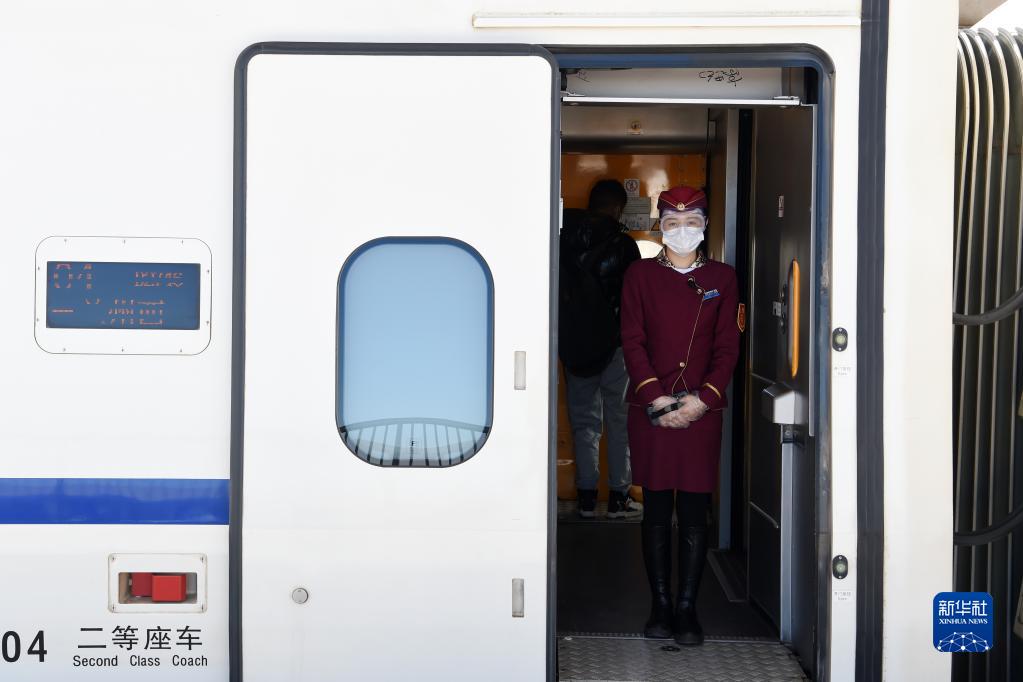 12月5日,在蘭新高鐵山丹馬場(chǎng)站,列車(chē)員等待列車(chē)關(guān)閉車(chē)門(mén)發(fā)車(chē)。新華社記者 范培珅 攝