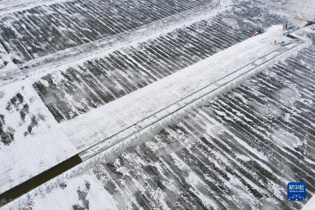 這是12月17日拍攝的松花江哈爾濱段被切割過(guò)的江面冰層(無(wú)人機照片)。